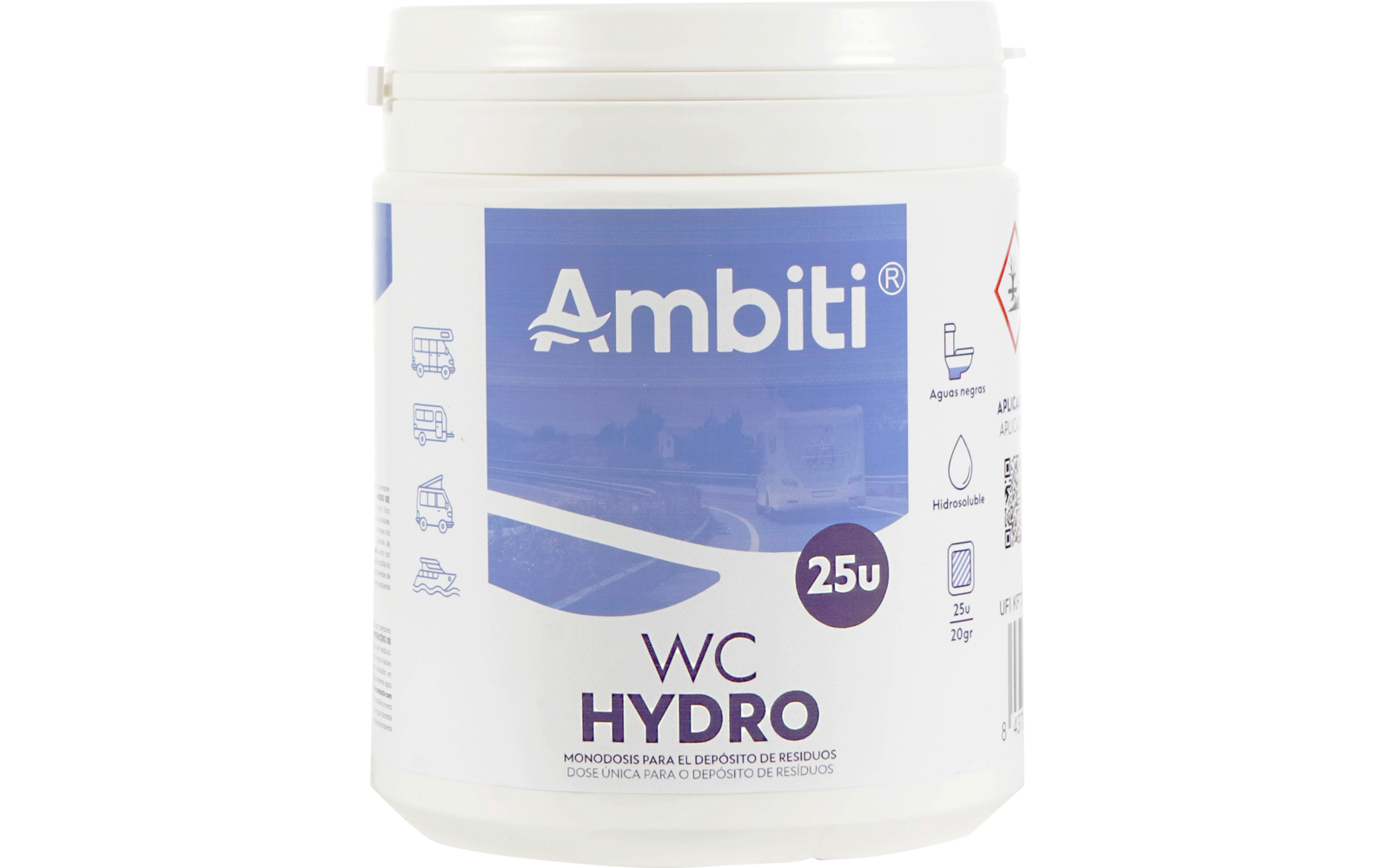 Mantenga su WC portátil fresco e higiénico con Ambiti Hydro. El neutralizador de olores biodegradable neutraliza y previene los malos olores, licua las heces y desinfecta para una protección duradera contra la contaminación. Gracias a las dosis individuales de 20 g, puede dispensar de forma rápida y limpia sin dañar los depósitos de plástico o goma.