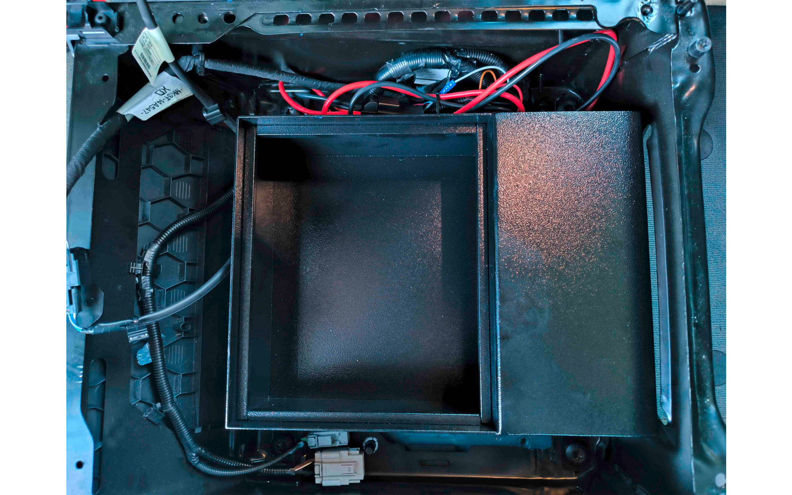 | Instalación en la consola del asiento del lado del conductor o del pasajero | Acceso desde arriba, funcionamiento con el asiento desplazado hacia delante | Fijación con atornillado original | Robusta chapa de acero, dimensiones 300 x 130 x 390 mm, peso 10 kg |